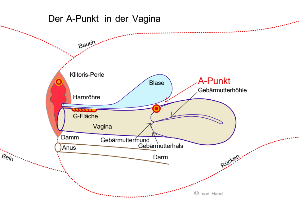 Der A-Punkt liegt tiefer als der G-Punkt, ebenfalls bauchseitig in der Einkerbung, wo der Gebärmutterhals in die Yoni ragt. Um ihn spüren zu können, braucht er etwas Druck in Richtung Bauchdecke. Aus den Erfahrungen in der Yoni-Massage zeigt sich, dass diese Zone das Tor in spirituelle und überpersönliche Räume sein kann.